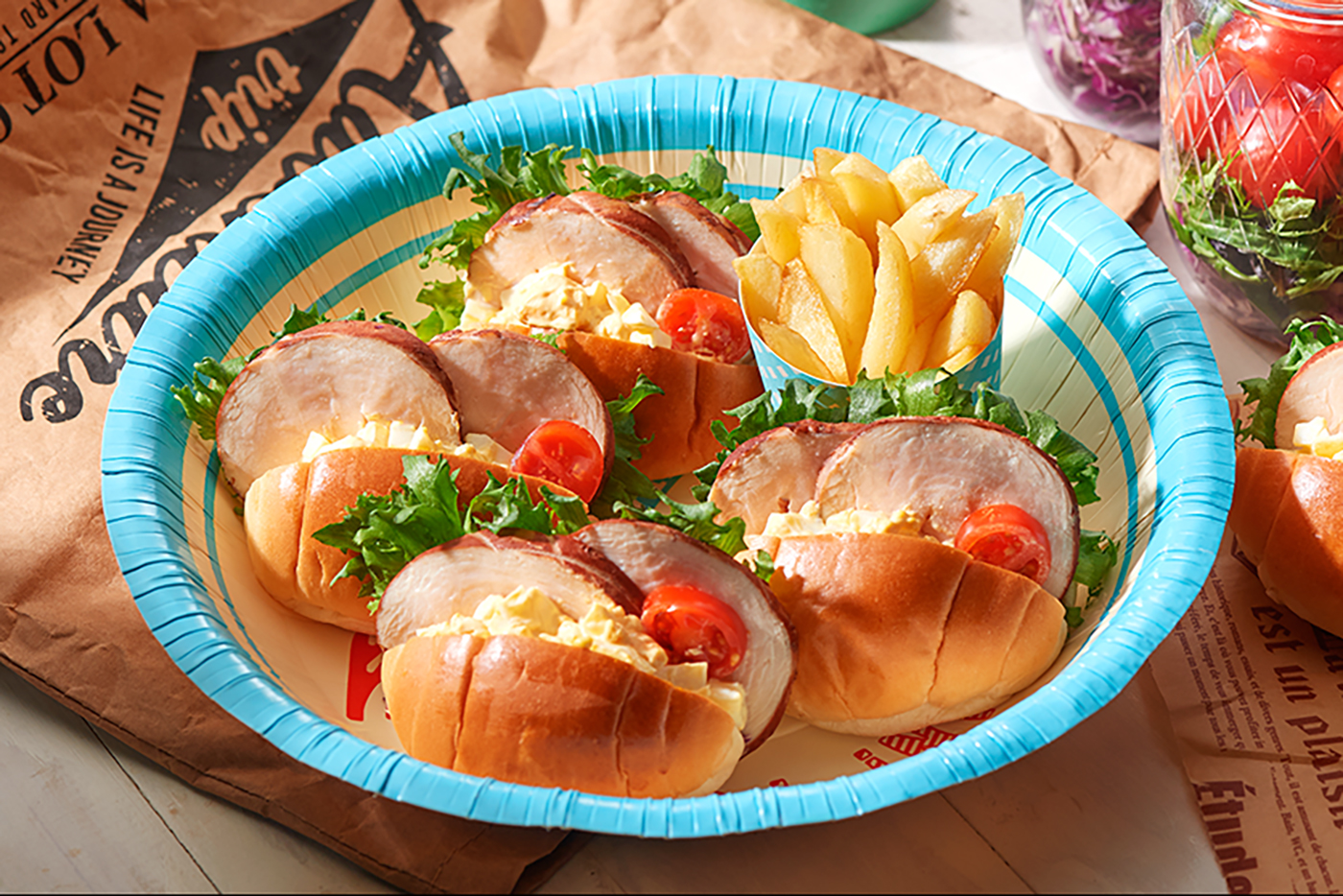 - ロールパンに切れ目を入れ、カットしたむね肉チャーシュー・レタス・ゆで卵・ミニトマトをはさみ込む。
