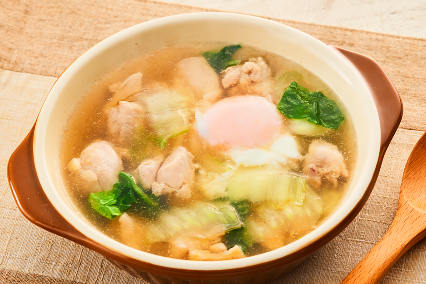 - 鍋にサラダ油をひき[1]の鶏もも肉を炒め色が変わったら[2]のそぎ切りにした白菜を入れ、水、【A】の調味料を加えて沸騰したら残りの白菜の葉、卵を1個ずつ入れ蓋をする。
