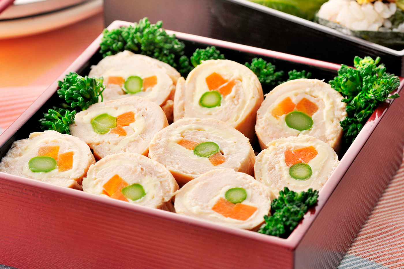 ※ささみの筋は叩くことで気にならない程度になります。 - 開いた1のささみに塩こしょうをし、チーズをのせて、軽く茹でたにんじん、アスパラをトッピングして巻いておく。