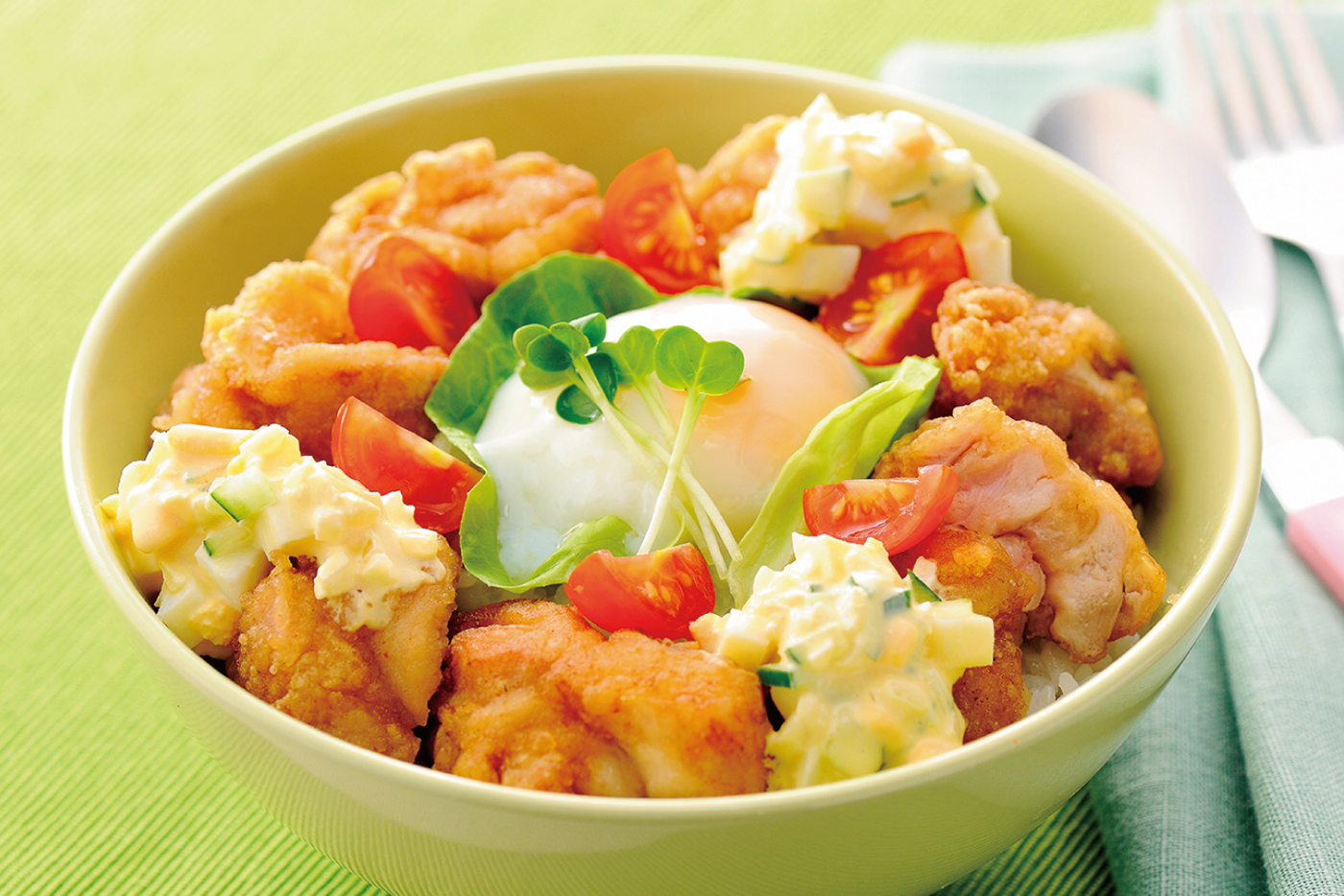 - 丼の真ん中にサラダ菜、温泉卵をのせ、タルタルソースをかけてプチトマトを飾る。