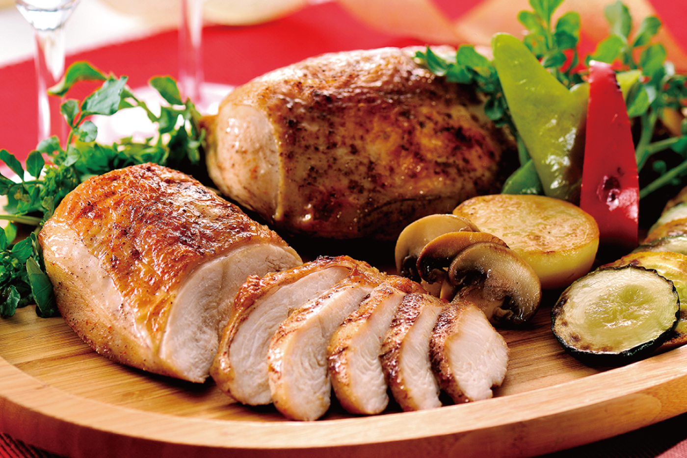 - 皿に取り出したムネ肉、焼いた付け合わせ、クレソンを盛り付ける。