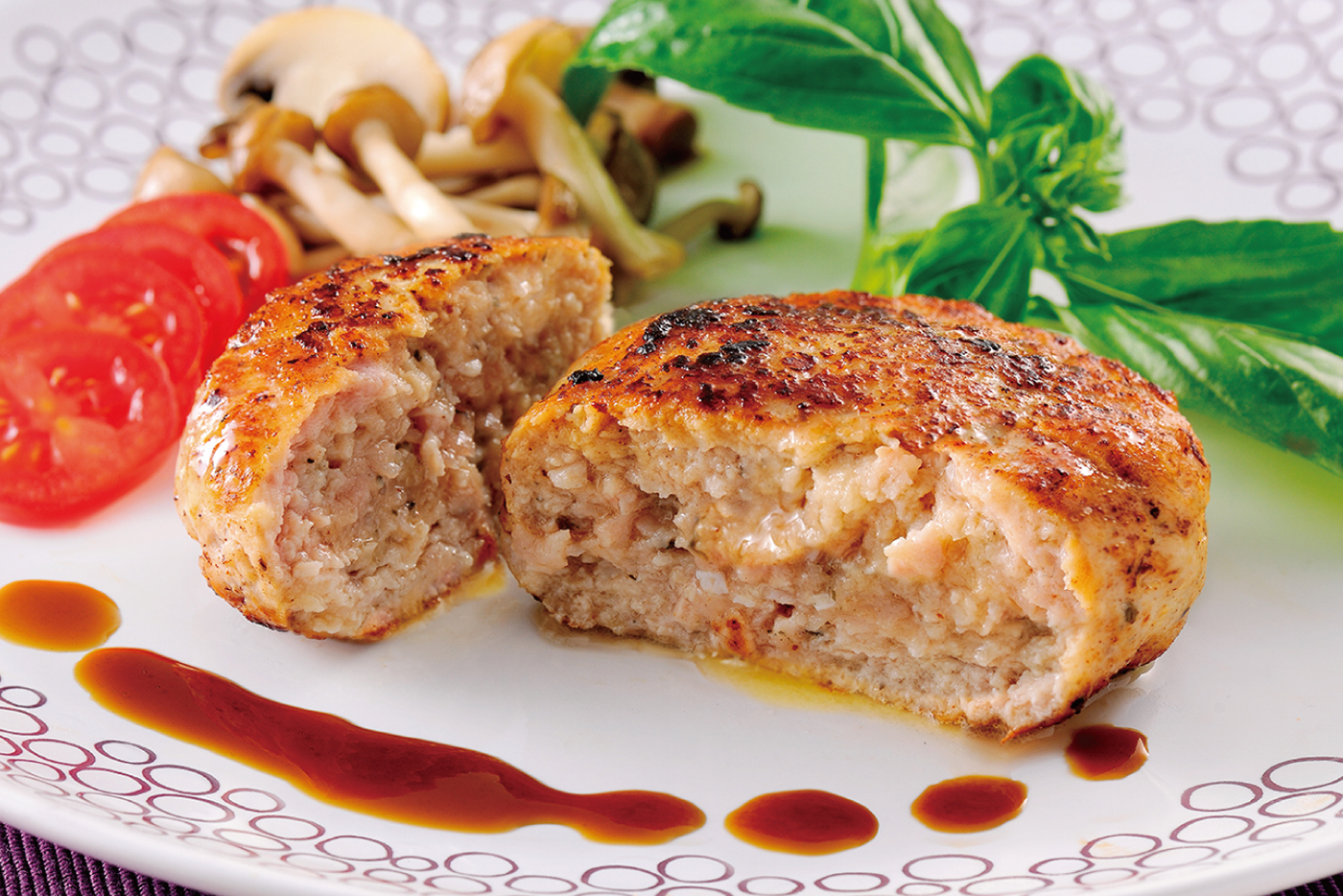 - [3]の皿にバジルを飾り、ハンバーグに[4]のソースをかける。
