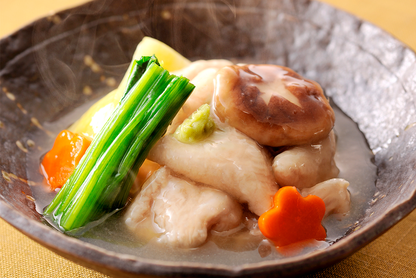 - しいたけは飾り包丁を入れ、にんじんは型抜きし、下茹でする。ほうれん草はさっと茹でて水気を絞り、4cmくらいに切っておく。