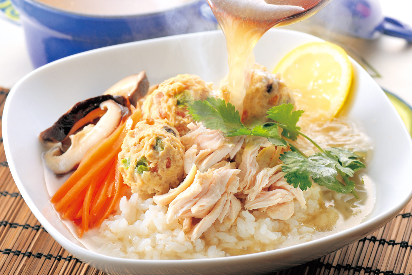 7. 器にご飯、ミンチボール、裂いたむね肉、しいたけ、にんじん、きざんだレモンの皮、春菜などお好みで盛り付ける。