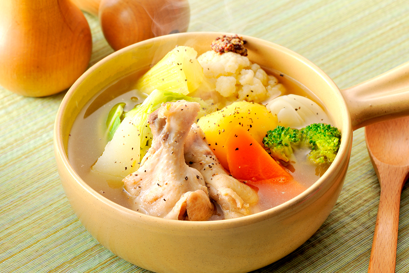 2. [1]の鍋に水、コンソメ、ローリエを入れ、じゃがいもを加えひと煮立ちしたら、残りの野菜を入れ、中火でコトコトと煮込む。(20~30分)