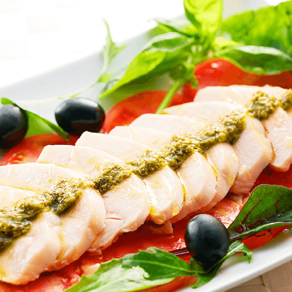 熟成鶏ハムのバジルソースかけ
